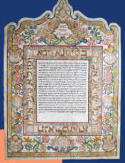 Credits: Contrat de mariage entre Gour Aryé Samuel, fils de Moïse Eliezer Cavalieri, et Bona, fille de Mazal Tov Pessah, Finale, 1776, encre, gouache et feuille d’or sur parchemin, dépôt de l’Alliance universelle israélite (AIU) @ photo Christophe Fouin, mahJ
