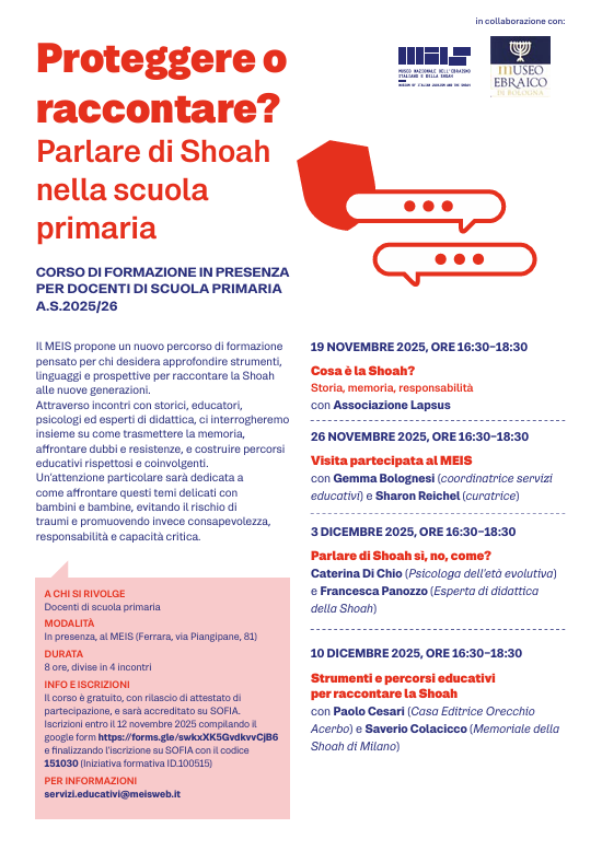 Il MEIS propone il nuovo percorso di formazione “Proteggere o raccontare? Parlare di Shoah nella scuola primaria” indirizzato ai docenti della scuola primaria e che si svolgerà in presenza al MEIS (via Piangipane 81, Ferrara).